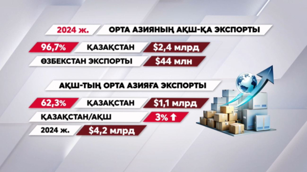 Біріккен ұлттар ұйымының Комтрейд дерегіне сүйенсек, былтыр аймақтан АҚШ-қа жөнелтілген экспорттың 97 пайызға жуығы Қазақстан үлесіне тиген. Бұл шамамен 2 млрд 400 миллион долларға тең сома. Салыстырмалы түрде алғанда, Өзбекстан экспорты бұл ретте 44 миллион долларды құраған. Сол сияқты Орта Азияға жеткізілетін америкалық тауарлар легінің 62 пайызы да елімізге тиесілі. Былтыр бұл бойынша импорт көлемі шамамен 1,1 млрд долларға жеткен. Бұдан бөлек, Ұлттық статистика бюросының мәліметіне сәйкес Қазақстан мен АҚШ арасындағы тауар айналымы елдің жалпы сыртқы сауда құрылымында 2,3 пайыздан 3 пайызға дейін өскен. Өткен жылы бұл көрсеткіш рекордтық 4,2 млрд долларға жетіп, бес жыл ішінде екі есе артқан.