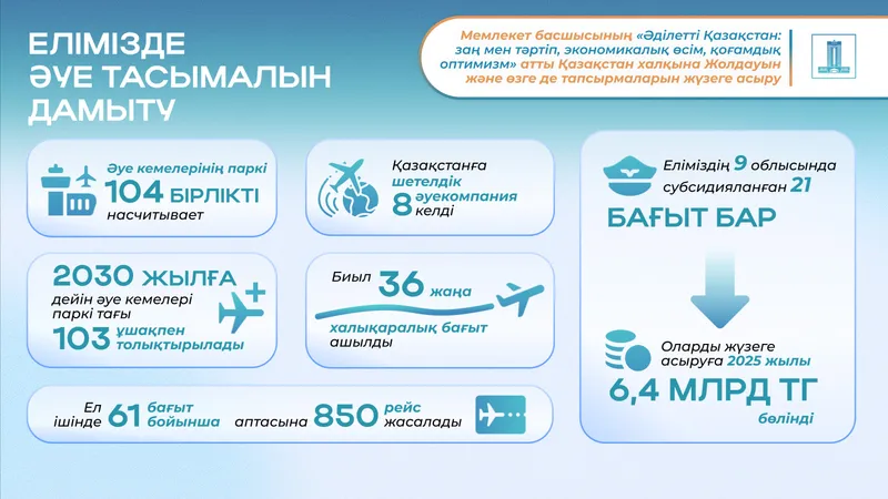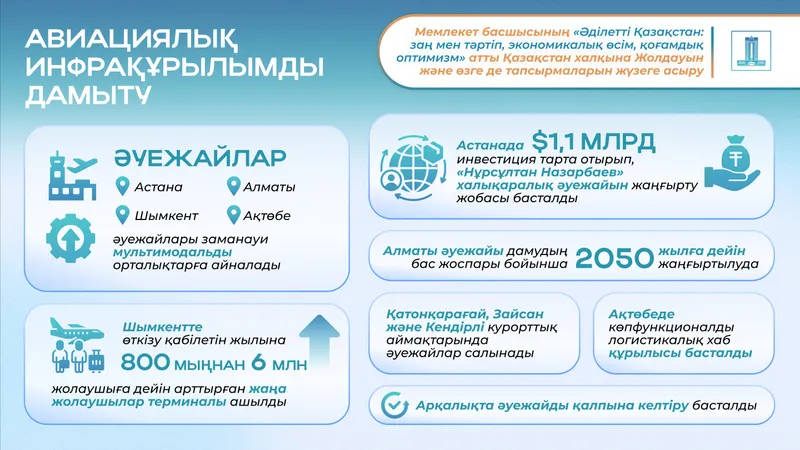 Авиациялық инфрақұрылымды дамыту Қазақстанның көлік саясатындағы басымдықтарының бірі болып қала береді. Президент Жолдауын жүзеге асыру жөніндегі Жалпыұлттық жоспарға сәйкес еліміздің жетекші әуежайлары – Астана, Алматы, Шымкент және Ақтөбе – логистикалық қызметтердің толық спектрін ұсынатын заманауи мультимодальды орталықтар ретінде дамуда.
