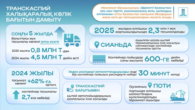 Бұл шаралардың барлығы Транскаспий бағытын Еуразиялық логистиканың негізгі буыны ретінде қарастыруға мүмкіндік береді, бұл еліміздің халықаралық сауда мен транзиттегі позициясын күшейтеді.