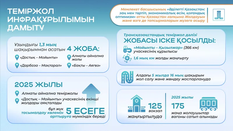 Қазақстан теміржол инфрақұрылымын қарқынды дамытып жатыр: ірі жобалар елдің транзиттік мүмкіндіктерін бірнеше есеге арттырады