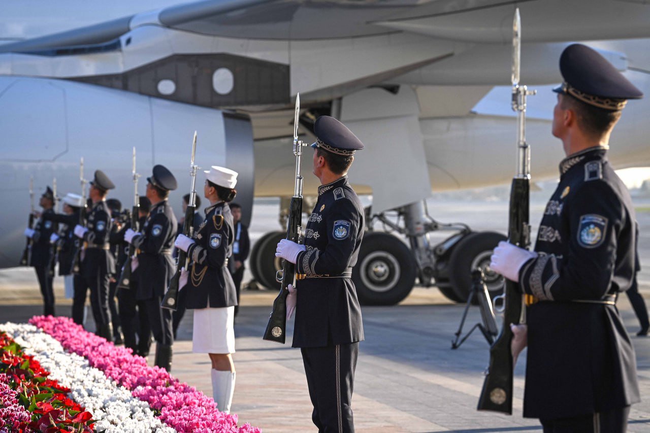 "Шығыс" әуежайында мәртебелі мейманның келуіне орай Құрмет қарауылы сап түзеді.