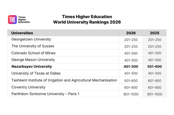Әлемдік беделді Times Higher Education World University Rankings (WUR) рейтингінің 2026 жылғы жаңартылған нұсқасына сәйкес, биыл бес қазақстандық университет тізімге еніп отыр. Тарихта алғаш рет Қазақстан әлемдегі ең үздік 500 зерттеу университеті қатарына таңдалып алынды. Рейтинг бойынша өңірде Nazarbayev University көш бастап тұр.